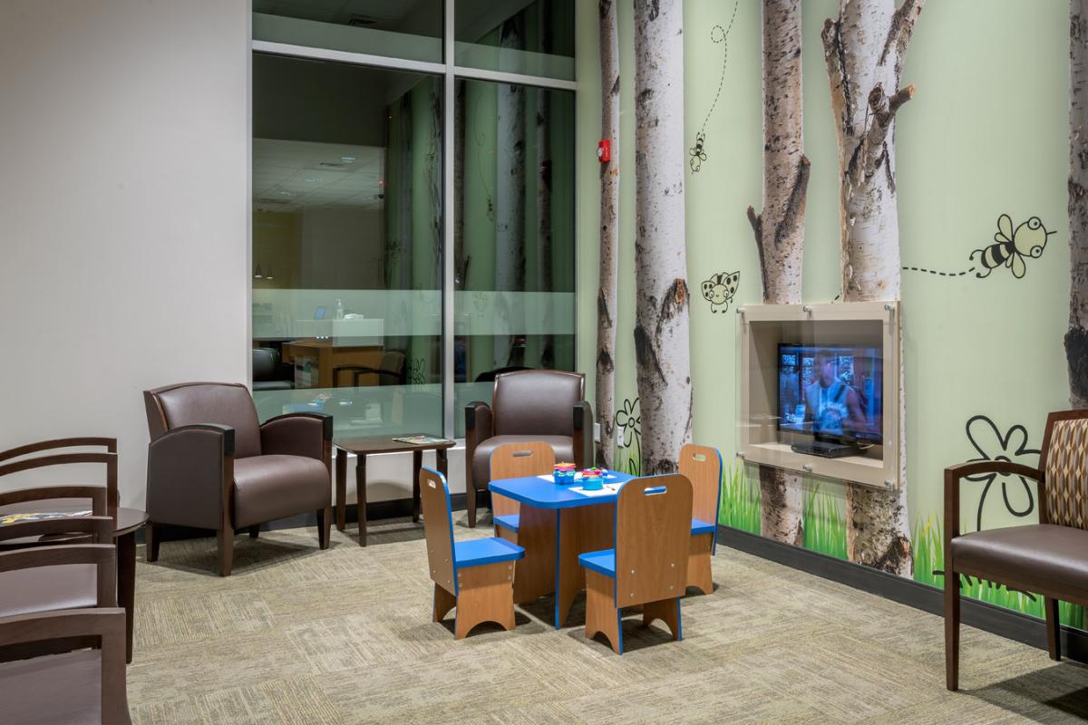Free Wi-Fi, children's activities, comfortable sofas, and cable TV help make visits less stressful for patients and families.
